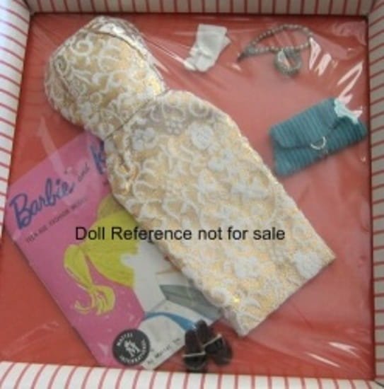 Mattel Barbie #961 Evening Splendor 1959-1963 – gold and white brocade dress, matching coat trimmed in real brown fur lined in light blue satin, turquoise corduroy purse, short white tricot gloves, white hankie, pearl and fur headband hat, white pearl necklace, brown open toe heel shoes and booklet. Reproduced in 2004, same dress as #911 Golden Girl, in 1963 a red 992 Golden Elegance version.