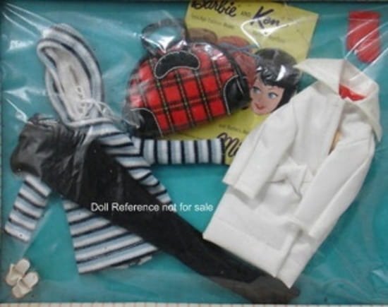 Mattel Barbie #968 Roman Holiday 1959 – red and white striped knit coat with a red half lining, matching dress in red, white bodice, navy skirt, white plastic belt, red straw half hat, white plastic clutch purse, a tiny real brass 3/8″ compact, opens on a hinge with mirror and tiny pink puff, engraved top with a “B“, black rimmed eyeglasses, clear and white plastic eyeglass case, white hankie, white comb, white short tricot gloves, pearl on a chain necklace, black open toe heel shoes. This outfit was reproduced. Note: original outfit only made in1959, rare.