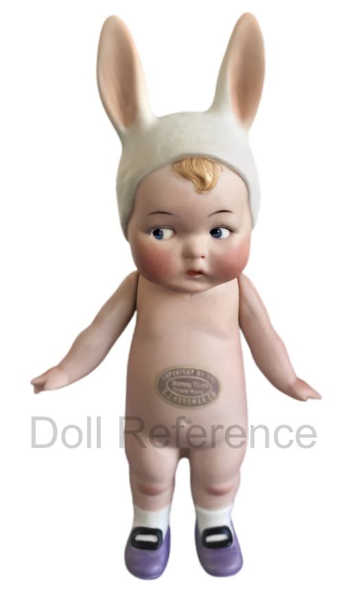 1924+ Horsman Bunny Tots dolls 6″ tall, all bisque, one piece doll with sculpted bunny hood and pink lined bunny ears, a blond tuft of hair at the forehead, painted side glancing eyes, closed pouty mouth and painted purple shoes and white socks. Marked on foot: Germany Bunny Tots trademark. Paper label on chest: Copyright by the E.I. Horsman Co. or could be labeled BonnyTot. “Bunny Tots Adventures” was the name of a character that appeared in the Washington Post as an illustrated column on Sundays in 1924 and became part of a series of books published by author, illustrator and creator Edward G. McCandlish in 1926 and republished in 1928.