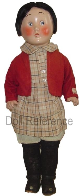 1921 Horsman Jackie Coogan doll 14″ tall, composition and cloth, Jackie was a child actor from the Charlie Chaplin film “The Kid” in 1921, there were two dolls; the first one used a generic molded doll head that was used on many other dolls, the second head was sculpted specifically for the doll by Helen Trowbridge with a likeness of the child actor and wore a pageboy wig. Both dolls are dressed in a turtleneck sweater, long pants with suspenders, checked cap and button that said “Horsman Jackie Coogan Kid Patented”.