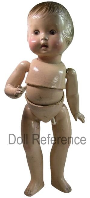 1922 Horsman Bye Bye Baby doll, height ?, a composition doll designed by Helen Trowbridge, when pulling a cord attached to both arms, the doll moved it’s arms and hands imitating a life like baby gesture of waving goodbye, probably doll marked E.I.H. or Horsman.