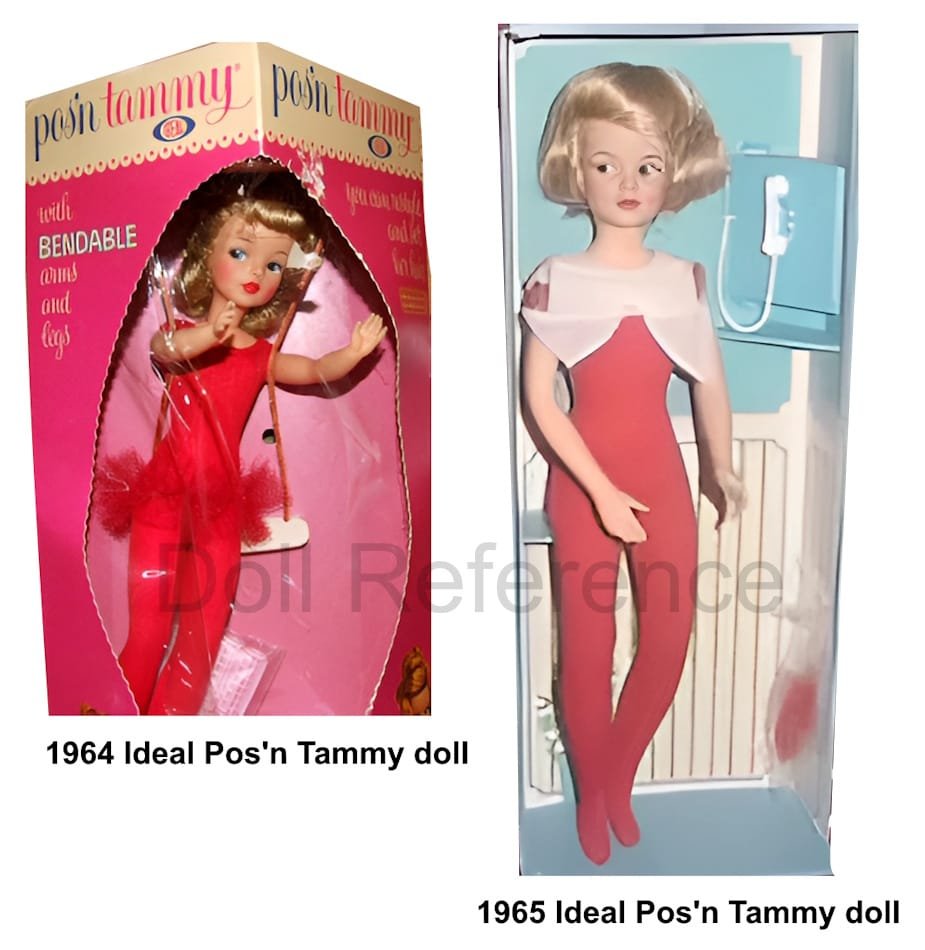 1964 Ideal Pos’n Tammy doll #9105-8 is 12″ tall has bendable posable legs, hair is fuller and has a braided bun, rest about the same as previous year, came in a red box and clear cellophane cover, we think the markings were the same too, but unsure.