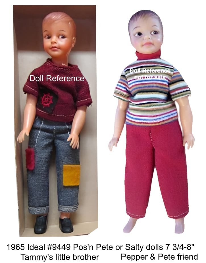 1965 Ideal Pos’n Salty doll #9449 is 7 3/4 – 8″ tall, is Pepper’s and Pete’s friend, same doll as the Pos’n Pete doll dressed differently in a striped knit shirt, rust pants, white tennis shoes and a brown vinyl baseball cap, Pos’n Salty doll marked on head © 1964 Ideal Toy Corp and on back  © 1964 Ideal Toy Corp P8,  same as the Pos’n Pete doll.