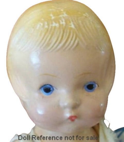 1931 Regal USA, Maizie doll, 16″ tall, Patsy type, all composition, jointed at shoulder and hips, molded painted hair, gray tin sleep eyes (also came with painted eyes) with real upper lashes, painted wispy lower lashes, closed painted mouth, came dressed in a short sleeved sun dress, bonnet, socks and oilcloth tie shoes, doll is unmarked. The Maizie doll head mold was also used by Toy Products Manufacturing Company of NY, USA with painted eyes, this doll has a one piece body and head, jointed at the shoulders and hips only, is 13″ tall, doll marked Toy Products, have seen this doll referred to as Lil Sis.