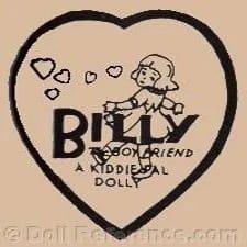 1930+ Regal USA, Billy the boyfriend, Bobby Anne, Dorothy Jane, Hug Me, The Judy doll, Kiddie Pal (Pale) Baby, Kiddie Pal Dolly, Kinky, Kiss Me, Love Me, Princess Wee-Wee, Smiles, Sonny Boy, Sweetie dolls are all part of the Kiddie Pal line and possibly others and came with a hangtag with the dolls name.